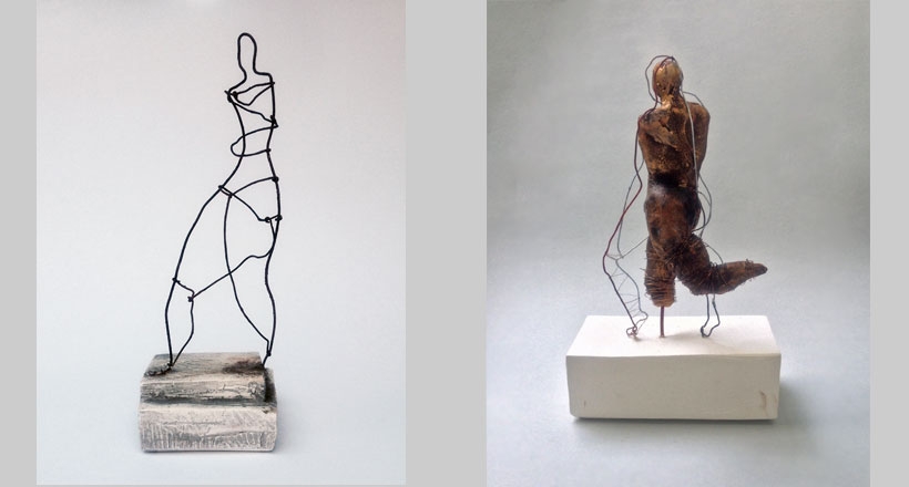 x_old – NextGen Drawings & Sculpture Invalid Displayed Gallery "Step-Up" and "Skip On" Image 3 of 7 [Left] "Step-Up". Wire on plaster base, H 25.5cms x W 8.5cms x D 8cms [Right] "Skip On", ceramic with wire, oxides & acrylic on plaster base, H 23cms x W 6.5cms x D 13.5 cms