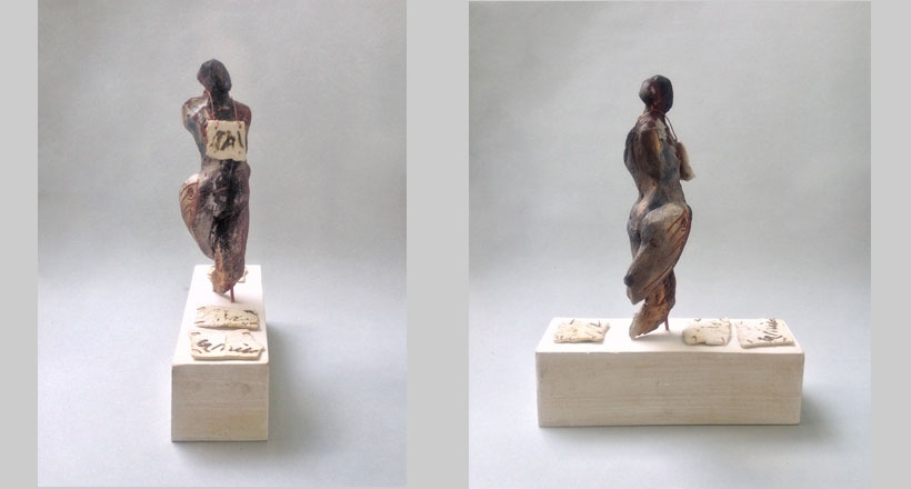 x_old – NextGen Drawings & Sculpture Invalid Displayed Gallery "Tagged" Image 6 of 7 [Front view] "Tagged", ceramic with oxides, acrylic & copper wire on plaster base, H 23.5cms x W 6cms x D 18cms [Left side view] "Tagged", ceramic with oxides, acrylic & copper wire on plaster base, H 23.5cms x W 6cms x D 18cms